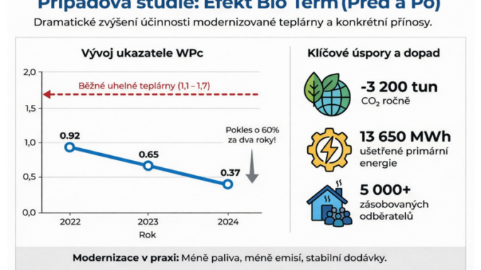Teplárna s elektrickým výkonem 6,658 megawattu a tepelným výkonem 10,988 megawattu zásobuje více než pět tisíc odběratelů prostřednictvím sítě o délce 6,7 kilometru. Zásadní je však vývoj její energetické účinnosti. Ukazatel WPc, který vyjadřuje množství neobnovitelné primární energie potřebné k výrobě jedné jednotky tepla, klesl v Bio Term z hodnoty 0,9204 v roce 2022 na 0,6475 v roce 2023 a dále až na 0,3733 v roce 20241. Pro srovnání, běžné uhelné nebo starší plynové teplárny se pohybují v rozmezí 1,1 až 1,72, tedy vykazují až čtyřnásobně vyšší spotřebu neobnovitelné primární energie na jednotku dodaného tepla. „Ukazuje se, že energetická transformace není ideologická debata, ale měřitelný technický proces. Moderní kogenerace se stávají páteří transformace proto, že přinášejí konkrétní čísla: nižší spotřebu paliva, nižší emise a stabilní dodávky,“ říká Pacovský.