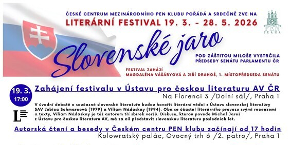 Praha 10. března 2026 (PROTEXT) – Literární festival Slovenské jaro 2026 pod záštitou předsedy Senátu Parlamentu ČR Miloše Vystrčila proběhne od 19. března do 28. května 2026. Slovenské jaro představuje cyklus jedenácti autorských čtení a besed se slovenskými spisovateli, kteří v současnosti výrazně ovlivňují slovenské kulturní prostředí. Festival zahájí Magdaléna Vášáryová, Jiří Drahoš a Ondřej Vaculík ve čtvrtek 19. března od 17 hodin v Ústavu pro českou literaturu AV ČR (Na Florenci 3, Dolní sál, Praha 1).