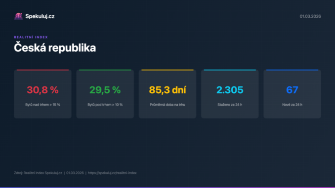 Praha 2. března 2026 (PROTEXT) – Podle aktuálních dat Realitního Indexu Spekuluj.cz je v Praze 30,5% bytů inzerováno nad tržní cenou o více než 15%, zatímco dalších 33,0% nabídek je pod trhem o více než 10%.